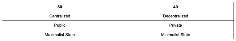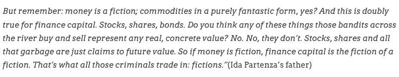What you find here is that at a high level, highly resistant assets are by definition likely to share attributes of being decentralized, scarce, and timeless. This is the radical way we must imagine portfolio theory. We must live our lives within institutions for the most part (60%), but we also need to live our private lives away from such institutions for it is not improbable that they may break during our lifetime, most likely in a fantastic way. To summarize this point, there is a wonderful quote from an author I love, Hernan Diaz who wrote the book “Trust”, where Ida Partenza’z father, an Italian anarchist, proclaims: