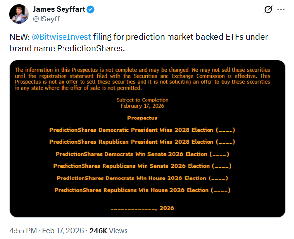 So on the heels of the CFTC announcement the very same day, we saw Bitwise launch a prediction market platform called PredictionShares, positioning it to offer the first ETFs tied to three political events: the presidential election and the congressional majorities of the Senate and the House.