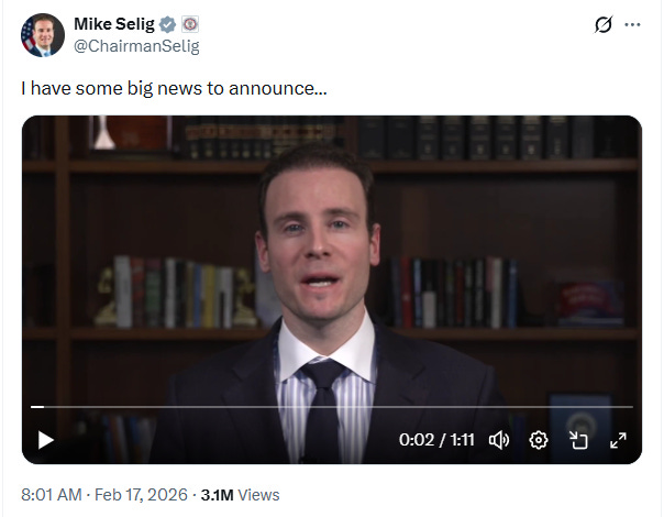 Yesterday on February 17th, CFTC Chairman Mike Selig showcased a historic defense of its right to regulate prediction markets as states came to challenge its authority. You can watch the video here, which he ends with the following assertion of exclusive jurisdiction: “To those who seek to challenge our authority in this space: let me be clear. We will see you in court.”
