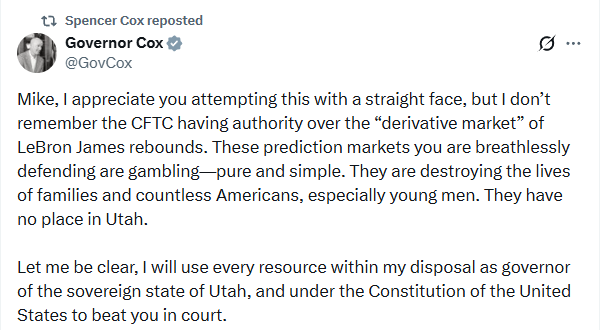 Shortly thereafter, Governor Cox of Utah responded with his own threat, equating prediction markets with gambling and asserting his own exclusive jurisdiction: “Let me be clear, I will use every resource within my disposal as governor of a sovereign state, and under the Constitution of the United States, to beat you in court.”